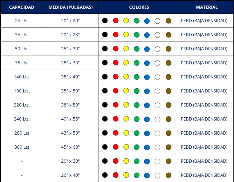 1. CAPACIDAD: Disponibles en diferentes capacidades, desde bolsas pequeñas para la cocina hasta bolsas más grandes para uso industrial, lo que permite adaptarse a diversas necesidades de eliminación de residuos.